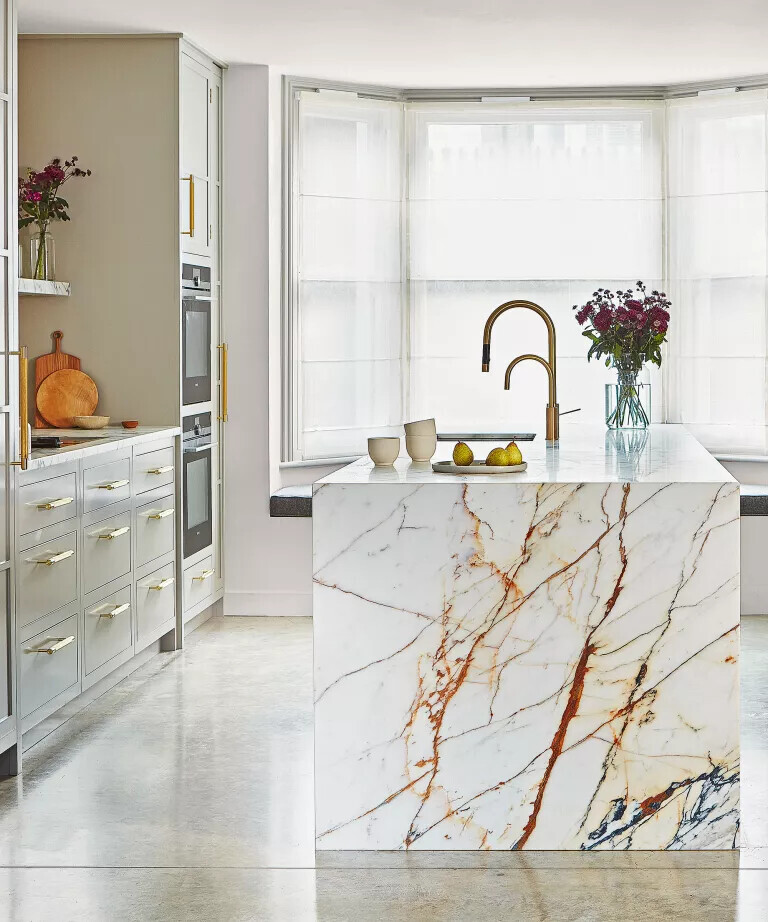 Exemplo de ilha de cozinha em carvalho fossilizado e mármore de calacatta (crédito da imagem: Minotticucine London)